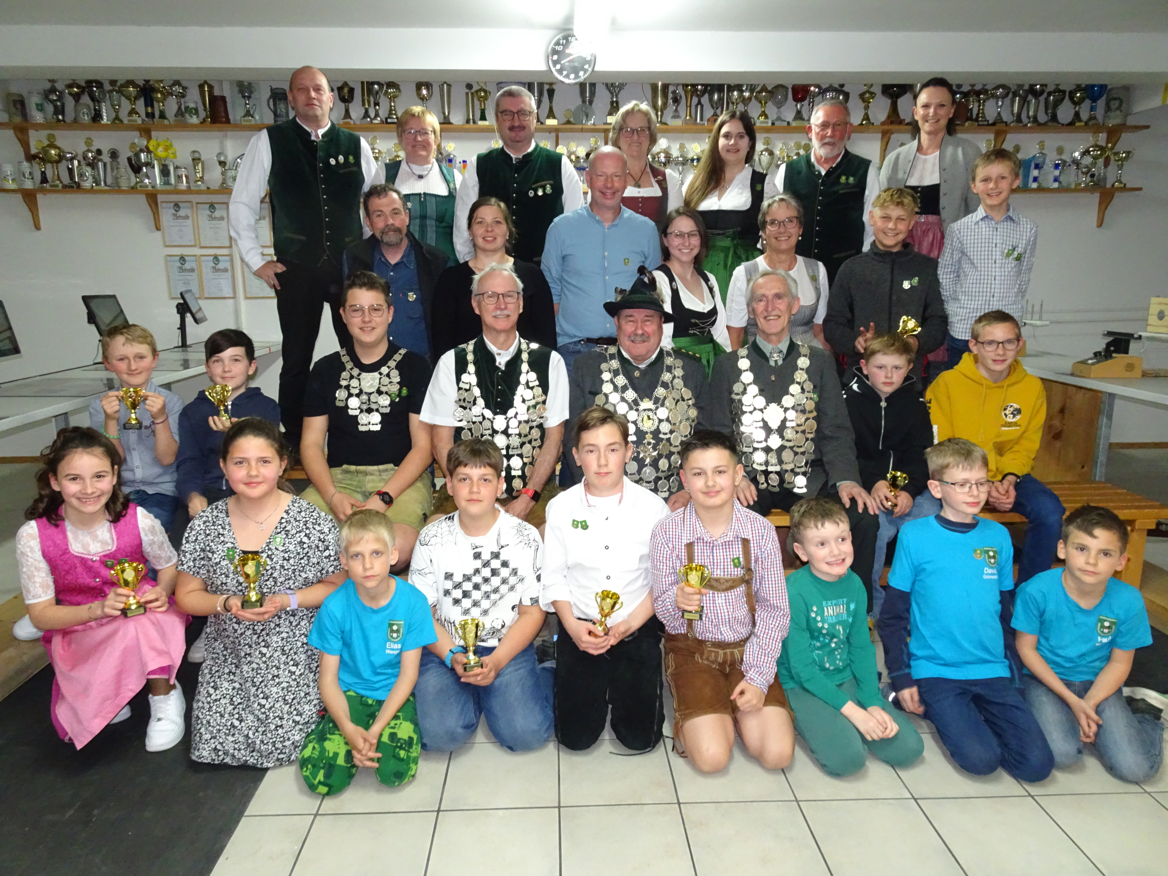 Schützenkönig Johann Neumeier, Jugendkönig Christoph Deliano sowie die Ritter Johann Maier und Jürgen Deliano im Kreise der Bestplatzierten der einzelnen Disziplinen und Altersklassen